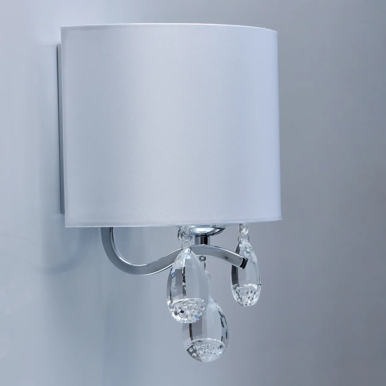 Основание/ металл/ хром. Абажур/атлас/ белый. Декор/прозрачный хрусталь.